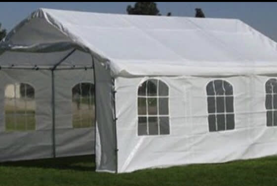 20’x20’ white canopies with side walls upon request. Make sure to have enough space available for set up. Make sure there is no trees or power lines overhead that can get on the way of setting up.